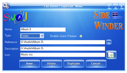 Click the Duplicate button to make a duplicate of the current launch Button contents, and to edit them easily as a new Button. Until you press the Save button nothing will be done to the Category and if you press Save, then the new Button will appear as the last launch Button in that Category Slot.