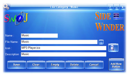 Right Click on a Category Slot to open the editor for that Category. Here you can change the display name of the Slot by editing the Name section, select a different Category file name by clicking the Select button besides the File Name text box or enter a different file name at the text box, change the Icon for that Category by clicking the Icon button and enter or change the Description of the Category Slot. You can also add a new launch Button to the Category by clicking the "Add New Button" button at the bottom right corner. To learn more about the available functions in the Category Editor please refer to the "Categories" section inside the built-in Help.