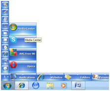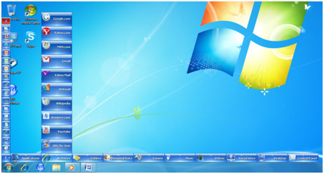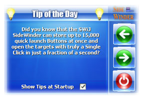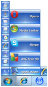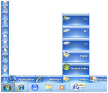 Bring the Mouse over the Nip and the SideWinder will expand immediately into a horizontal bar of 10 Category Slots and a vertical Side Bar will appear over the enlarged Nip. If you move the Mouse over a Category then it will popup a sub page of quick launch Buttons over it. You may click any of the Buttons to launch the relevant Application or Website immediately.