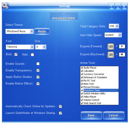Click the Settings Button on the Side bar to open the SideWinder - Settings window as shown below. Here you can enable / disable; Sounds, Transparency, Button Shades, Button Effects, Automatic Update, Startup Launch etc. Also you can change the SideWinder Theme from the drop down combo box. Click Apply button to apply the selected Theme immediately. To know more on the Settings window please refer to the "Settings" section inside the built-in Help.