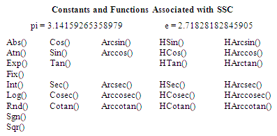 Bring the Mouse over the "Calculator" button at the Side Bar in order to open the built-in Scientific String Calculator. The SSC is a convenient and a powerful tool to perform long length string calculations and the evaluation of complex scientific formulae. Use the predefined buttons on the Calculator or type your equations inside the display text box and then hit the 'Enter' key to get the results. Double Click on the Caption Bar to hide the SSC or drag it by holding the Mouse down on the Caption Bar. Click the 'Paste' or 'Copy' mini buttons to perform Clipboard functions. Below is a list of constants and functions which can be used in the SSC.