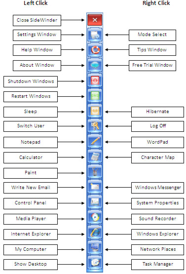 Bring the Mouse over the "Show Desktop" button at the Side Bar to display the Switch Window Utility. To switch to an opened window just move the Mouse over that window's Icon and remove the Mouse upwards from its block. Left Click on its Icon to Maximize or Restore the window and Right Click on it to Minimize the window. Double Click on the Switch Window bar to Maximize all opened windows and Right Click to Minimize all. Click on the Close button to close that particular window easily. If a Window has several Tabs like a Web Browser, you can cycle between the Internal Tabs by clicking the MouseWheel button once on that particular Icon and rotating the Wheel Up or Down.