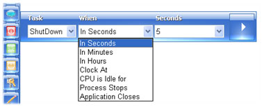Bring the Mouse over the "Shutdown" button at the Side Bar to open the built-in Shutdown Timer Utility. Before you start the timer first select the Task, and then select the Mode, and finally select the Target from the combo boxes. Then click the 'Start 'button to begin the timer. Click it again to stop the timer.