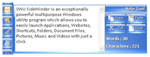 Bring the Mouse over the "Notepad" button at the Side Bar to open the Note Tool. Use the Note Tool to preserve your temporary texts and notes to use them later. The tool can also be used as an extended alternative to the Windows Clipboard. You may drag the Note Tool by pressing the Mouse Down on the caption to any location on your screen and hide the Tool by Double Clicking on it. Also get instant Character and Word counts while you type.