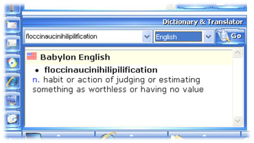Bring the Mouse over the "Notepad" button at the Side Bar to open the Dictionary & Translator along with the Note Tool. Enter the word you want to get the meaning or translation in the first combo box and select the target language in the second combo box and then hit the 'Go' button to begin displaying the results. The default language is selected as English and you may select any of the 17 languages in order to get the translations for your word or phrase. Please remember to be online when using the Dictionary. You can also drag the Dictionary & Translator Tool by pressing the Mouse down on the caption to any location on your screen and hide the Tool by Double Clicking on it.