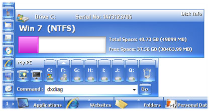 Bring the Mouse over the "My Computer" button at the Side Bar to open the My PC Tool. The tool will display some additional and useful functions for your PC and line up the available Drives and Disks on your machine for quick and easy access. You can immediately turn off the Monitor display by clicking on the "Turn Off Monitor" button. The display can be turned back on by moving the Mouse or pressing the keys on the Keyboard. You can instantly open the DOS Command Prompt by clicking on the "Command Prompt" button.