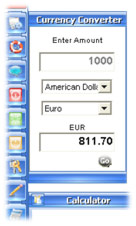 Bring the Mouse over the "Calculator" button at the Side Bar in order to open the Currency Converter Tool. The Currency Converter supports in between conversion of all major International Currencies and you need to be online in order to properly run the Converter with the latest Currency Exchange Rates. Enter the amount in plain numeric value in the first text box to be converted and select the From and To Currencies from the combo boxes below. Then click the 'Go' button to get the upto-date converted amount immediately.