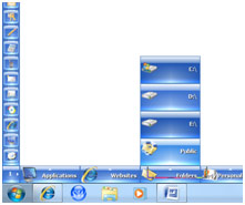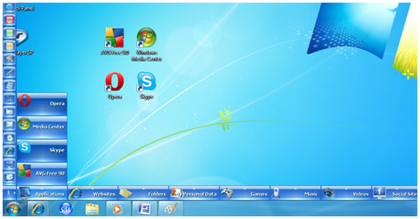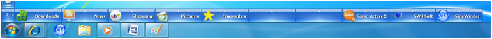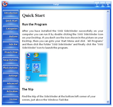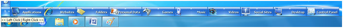 Bring the Mouse over the Nip and the SideWinder will expand immediately into a horizontal bar of 10 Category Slots and a vertical Side Bar will appear over the enlarged Nip. If you move the Mouse over a Category then it will popup a sub page of quick launch Buttons over it. You may click any of the Buttons to launch the relevant Application or Website immediately.