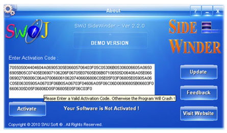 Click the About Button on the Side Bar to open the SideWinder - About windows. Here you can enter your Activation Code at the text box and click the Activate button to activate the SideWinder to Full Version online. Also you can get the latest version of the SWiJ SideWinder by clicking the Update button. To learn more about the Activation process please refer to the "Activation" section inside the built-in Help.